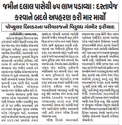 Post navigation પોપ્યુલર ગ્રૂપના પ્રથમેશ અને વિક્રમ પટેલ વિરુદ્ધ આનંદનગર પોલીસે હત્યા ની કોસીસ નો ગુનો નોંધ્યો પોપ્યુલર ગ્રુપ ની એક જાર કરોડની જમીનનો બેનામી પ્રોપર્ટી એટ અંતર્ગરત ટાંચ માં લેવાશે